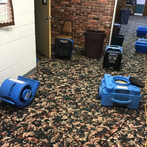 The professional water damage mitigation company used standard equipment for removing the water standing in the corridors, entrances, the main level, attic, church hall, and gym